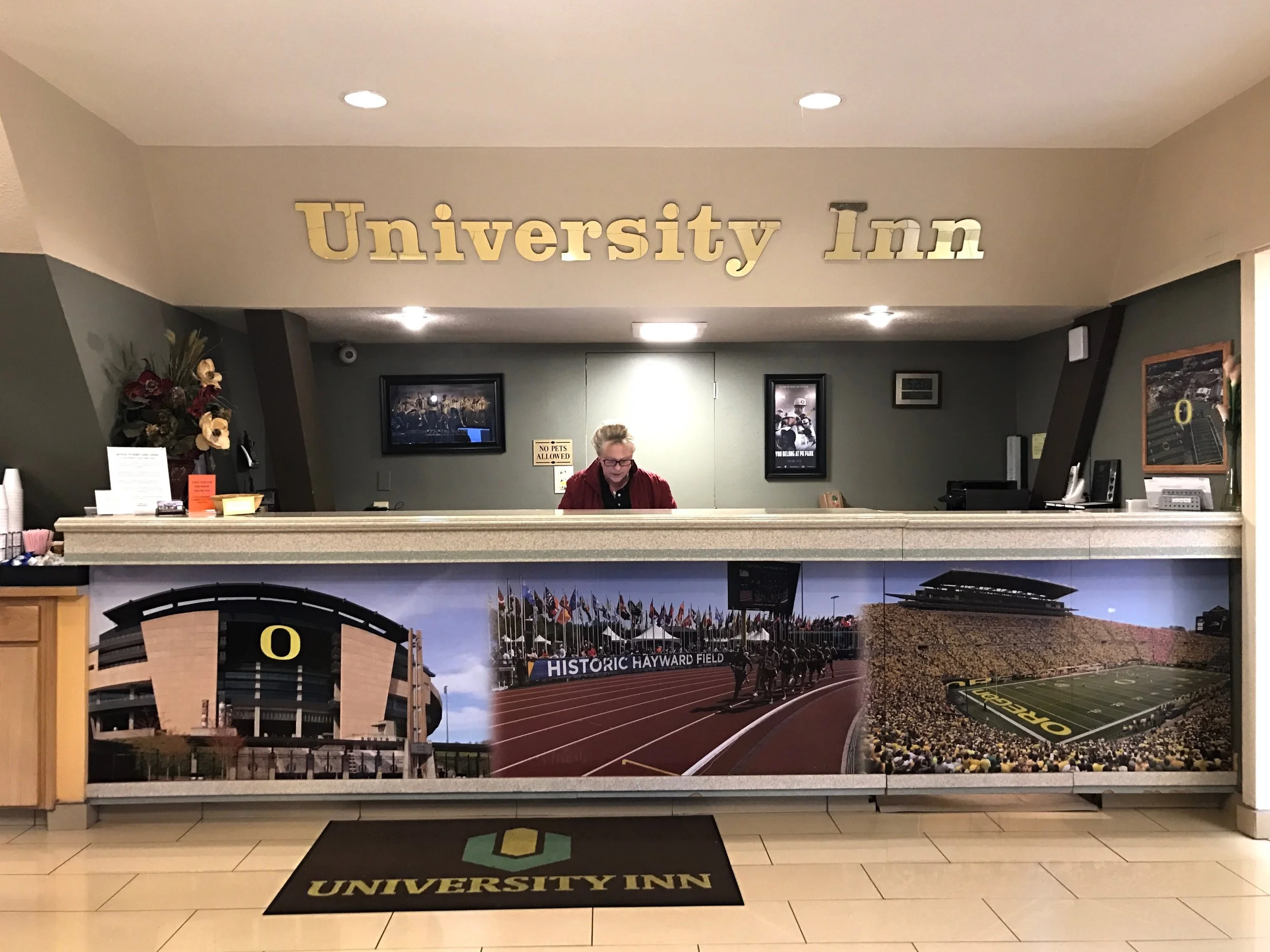 Dejamos las botas en su estante y le comentamos a la dependienta que nos pensaríamos la compra mientras tomábamos un café en el bar de al lado. Salimos de la tienda y al ver que la intensidad de la lluvia había disminuido considerablemente dejamos aparcado el café y desaparcamos la pick-up para poner el pie sobre el acelerador y llegar antes de que anocheciera a Eugene. Y lo conseguimos. Por poco, pero lo conseguimos. Encontramos habitación en el hotel Univeristy Inn. Su ubicación era excepcional. Teníamos a escasos metros el Campus Universitario, el Pre´s trail y el Pizza Town. Hicimos el check-in.