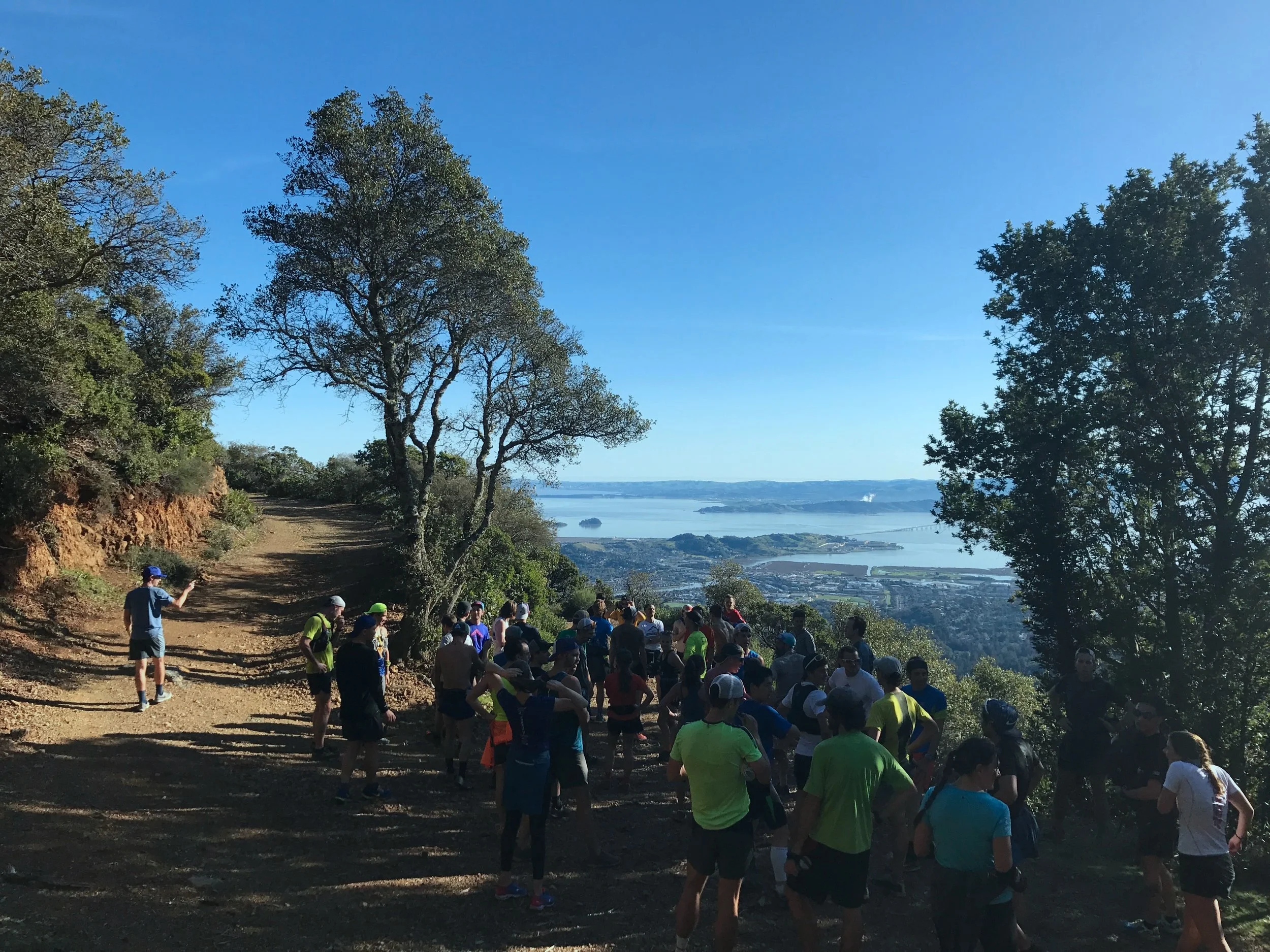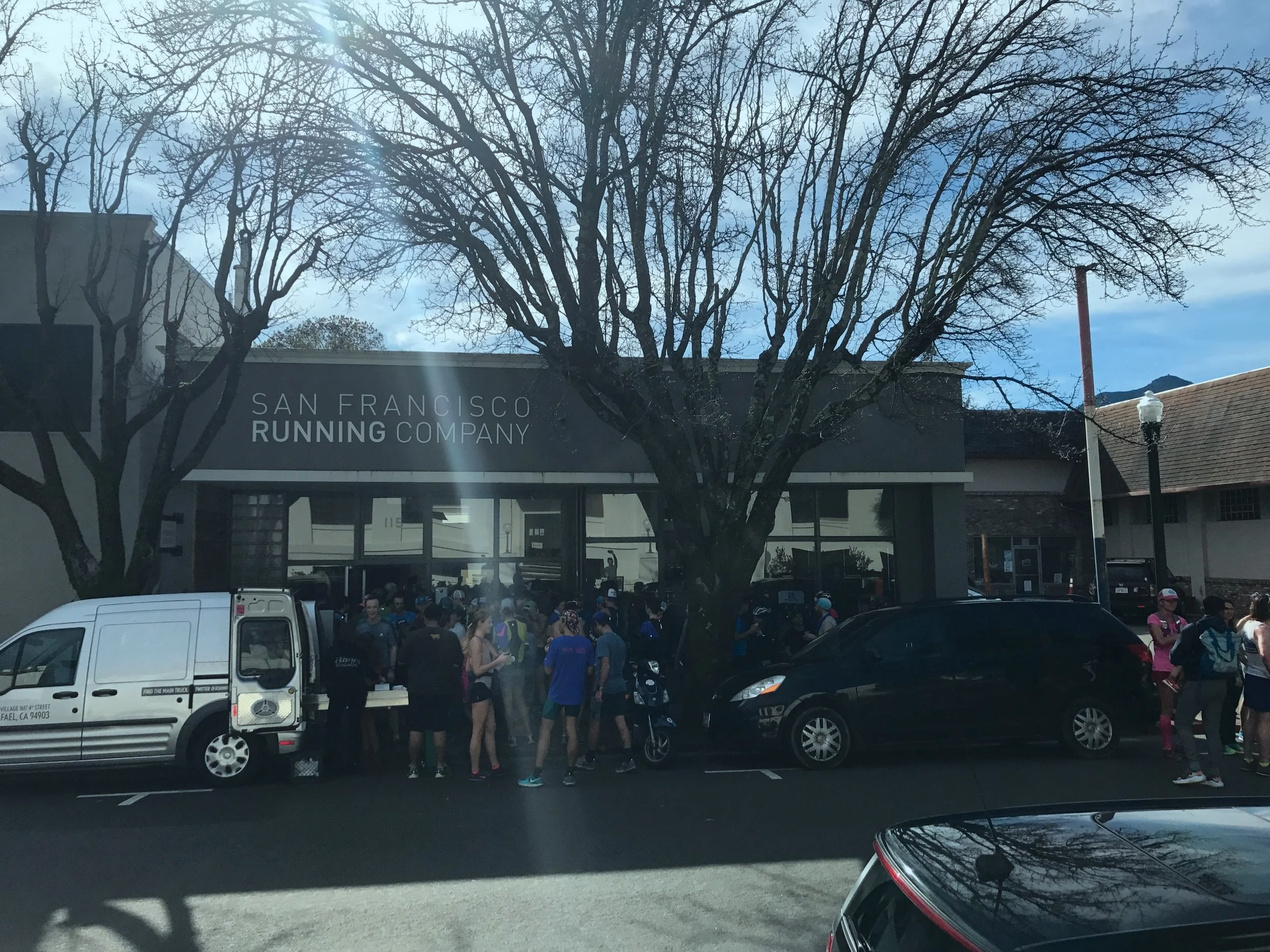 Era nuestro décimo día en Estados Unidos. Habíamos corrido por nuestra cuenta en Mendocino, Coos Bay, Beaverton, Portland e Yreka. En Zena y Folsom nos habíamos colocado un dorsal y en Portland, una de las tres noches que pasamos en la ciudad, compartimos encuentro con los Stumprunners. Aquello que nos esperaba era una incógnita… Nos habíamos despertado con un leve, muy leve dolor de cabeza. Probablemente a causa de la botella de vino de la noche anterior. Nos refrescamos la cara con agua bien fría y nos miramos al espejo. Teníamos buen color. Los chiches se debieron comportar por la noche. Como de costumbre, nos pusimos la ropa de correr, metimos algunas prendas limpias y un par de toallas en la mochila y cogimos la pick up para llegar al Equator Coffe Roaster de Larkspur. Llegamos pronto. De hecho llegamos los primeros. Allí no parecía que iba a haber un encuentro de corredores para compartir una salida de running. Entramos en el café y preguntamos si estábamos en el lugar correcto. En seguida nos confirmaron que estábamos en el punto de salida pero que todavía faltaba una hora y media para que empezara la actividad. ¡Perfecto, aprovecharemos para desayunar sin prisas! Nos sentamos en una mesa interior y pedimos café y un bol de muesli con frutos rojos frescos. Espectacular. Poco a poco fueron llegando los participantes y cada vez nos quedábamos más sorprendidos. Pensábamos que seríamos cuatro pulgas pero la convocatoria había activado a algo más de 100 personas. ¡No está nada mal para un domingo cualquiera! Antes de dar la salida, los chicos de SFRC hicieron un pequeño briefing.